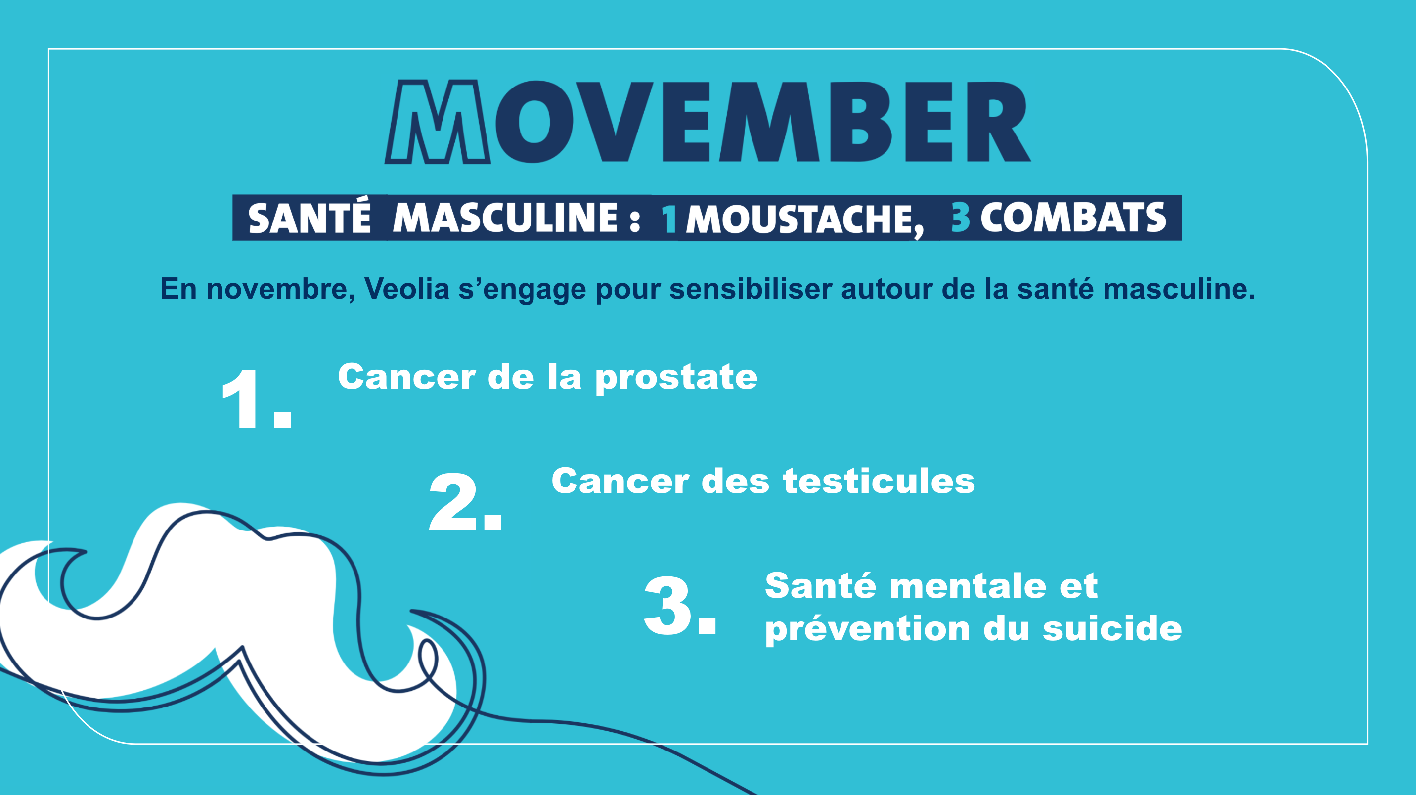À l’occasion de Movember, Veolia France s’engage à sensibiliser ses collaborateurs autour de trois enjeux majeurs : le cancer de la prostate, le cancer des testicules et la santé mentale des hommes.